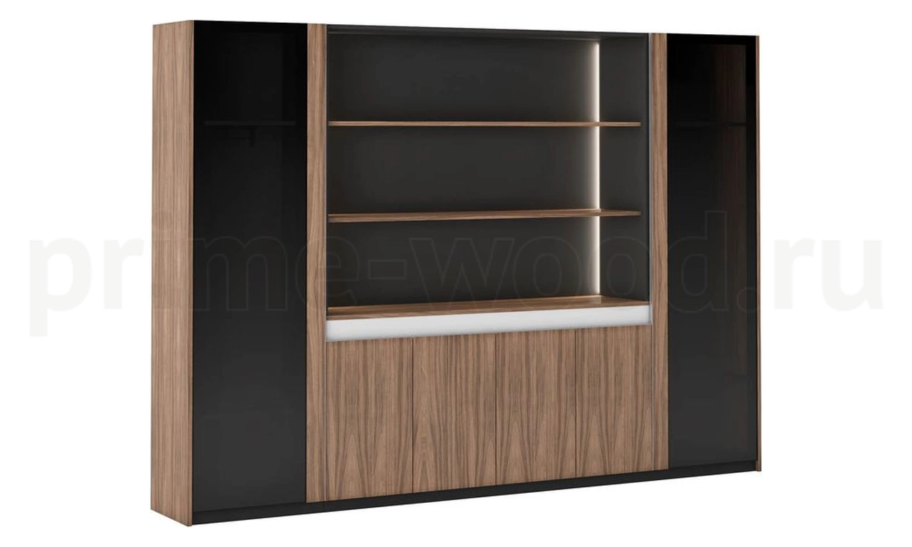Высокий модульный шкаф с тонированными стеклянными дверками в черной металлической раме, греденция с 4 дверками и верхняя открытая секция. Пространство секции со светодиодной подсветкой. Декоративная вставка белого, черного цвета, или цвета шоколад. Шкаф может комплектоваться боковыми стеллажами.